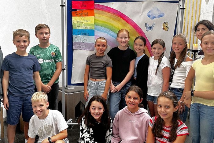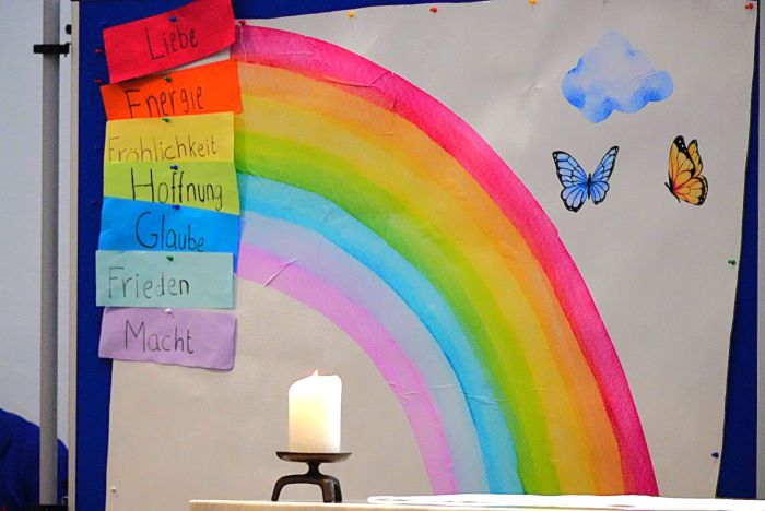 Der 28. August begann für die neuen Schülerinnen und Schüler sowie deren Eltern und Verwandte mit einem ökumenischen Begrüßungsgottesdienst, der von den Religionsgruppen der ehemaligen Stufe 5 vorbereitet worden war. „Der Regenbogen als Neuanfang und als Zeichen der Liebe Gottes“, so lautete das Thema, das den Regenbogen mit seinen Farben als Symbol für Friede, Hoffnung und Liebe darstellte.