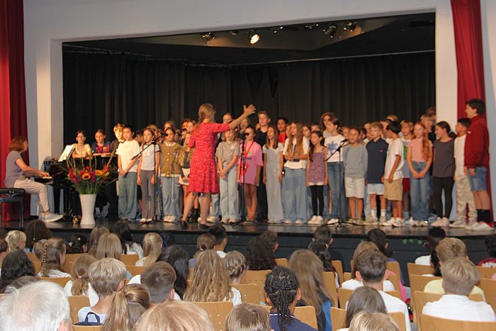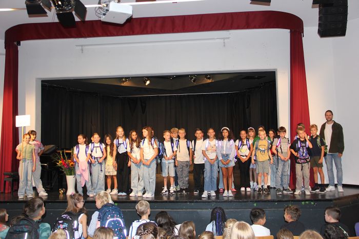 Es folgte die Einschulungsfeier in der Aula, zu der der Schulleiter Herr Jürgensen-Engl und sein Stellvertreter Herr Ropohl die neuen Fünftklässlerinnen und Fünftklässler mit ihren Familien herzlich begrüßten. Sie wünschten allen einen guten Start und riefen zu Fleiß und Respekt auf. Die Singeklasse der Stufe 6 sorgte für musikalische Unterhaltung, bevor die sieben Klassenleitungsteams mit ihren neuen Klassen zunächst für ein Gruppenfoto auf die Bühne kamen und dann in ihre Klassenräume zur ersten Unterrichtsstunde an der neuen Schule gingen. In den kommenden zwei Jahren werden Frau Bösader und Frau Bieker als Koordinatorinnen der Erprobungsstufe sowohl den neuen Schülerinnen und Schülern als auch ihren Eltern mit Rat und Tat zur Seite stehen.
