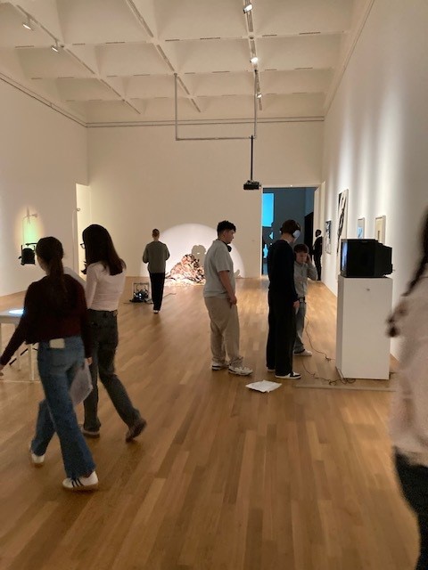 Schon beim Betreten der Ausstellungsräum kann man hören, dass diese Ausstellung nicht bedeutet sich ruhig in den Räumen umzuschauen, man hört das Summen von Projektoren und Stimmen im Hintergrund von den projizierten Videos.