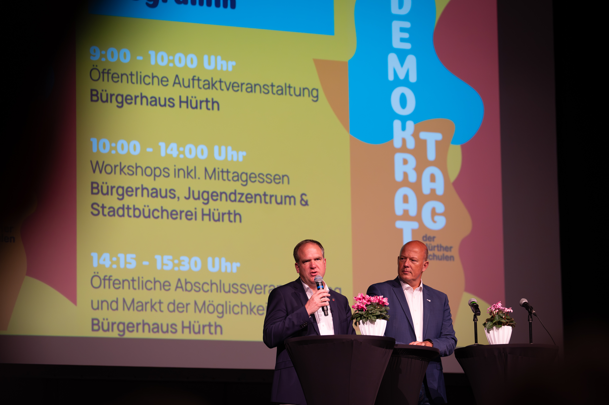 Schulleiter Thorsten Jürgensen-Engl dankte allen Beteiligten und hob die besondere Zusammenarbeit der Hürther Schulen hervor: „Dieser Tag zeigt, was möglich ist, wenn wir gemeinsam Verantwortung übernehmen – für unsere Schule, unsere Stadt und unsere Demokratie.“