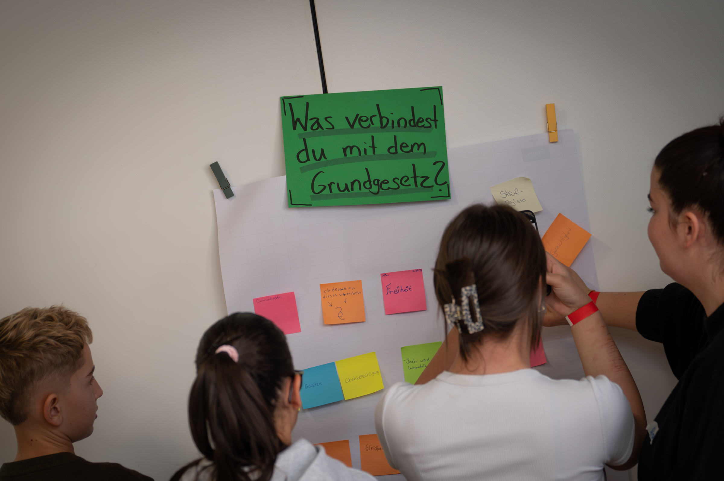 Auch im Kunstprojekt „Kunst trifft Demokratie“ wurde Demokratie sichtbar: Schülerinnen und Schüler gestalteten Collagen zu den ersten zehn Artikeln des Grundgesetzes. Mit allen Werken wurde das Bürgerhaus geschmückt und symbolisch gezeigt, dass Demokratie viele Stimmen und Gesichter hat.