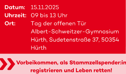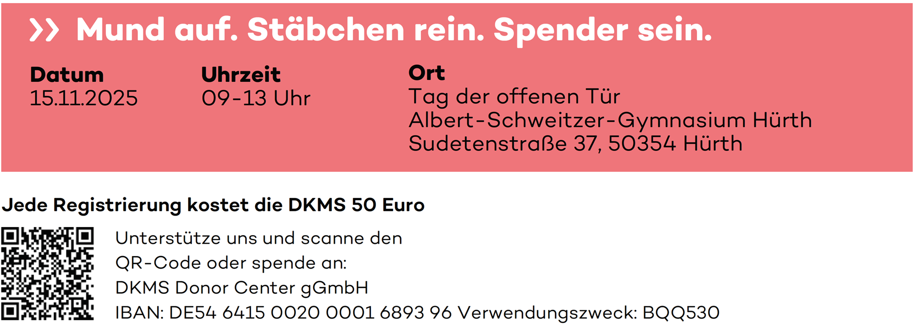 Im Rahmen des Tages der offenen Tür stützen wir eine Stammzellenspendeaktion. Kommen Sie dazu einfach zum Stand „Verantwortung“ in der Aula. Dort können Sie sich direkt und einfach registrieren lassen.