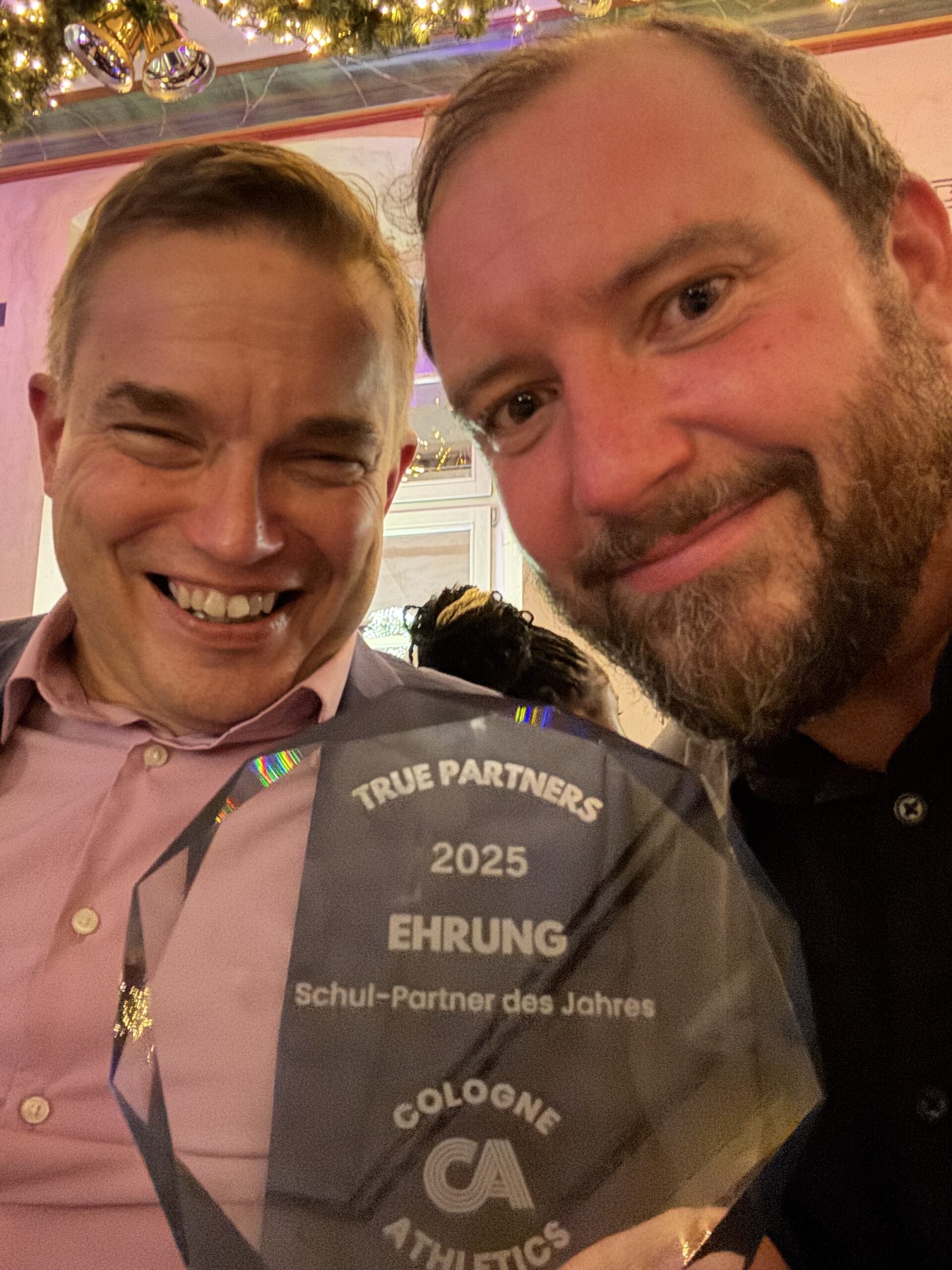 Am Abend des 16.11.2025 wurden im Rahmen einer feierlichen Gala in der Kölner Eventlocation Wolkenburg Athlet:innen von Germany Athletics sowie besondere Club-Partnerschaften ausgezeichnet. Dabei erhielt das ASG, an dem Abend vertreten durch Herrn Brands als Vorsitzender der Fachschaft Sport sowie Herrn Ropohl als stellvertretenden Schulleiter, die besondere Auszeichnung „Schulpartner des Jahres“ überreicht. Gegenstand der Kooperation zwischen dem ASG und Cologne Athletics sind unter anderem die Teilnahmen an der Talentiade sowie an den Kölner Schulstaffeltagen. Darüber hinaus waren auch unsere Schweitzer-Games im Juni 2025 für alle Schüler:innen der Stufe 10 ein Zeichen der besonderen Förderung der Leichtathletik und ein herausragendes Schulsportevent.