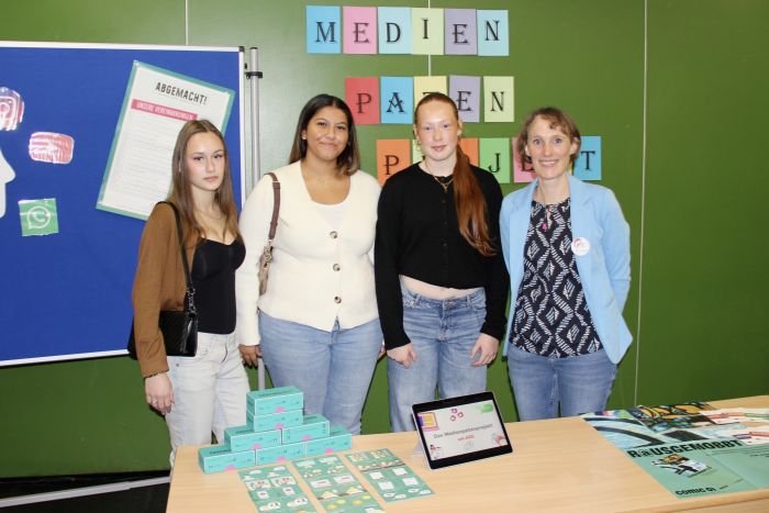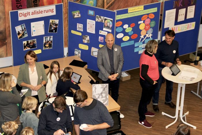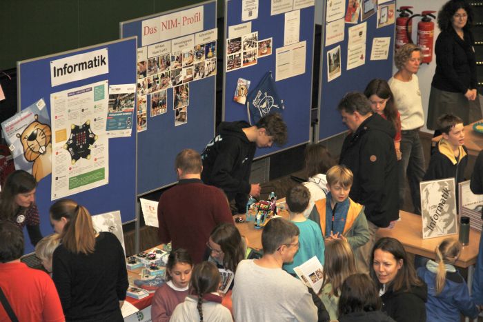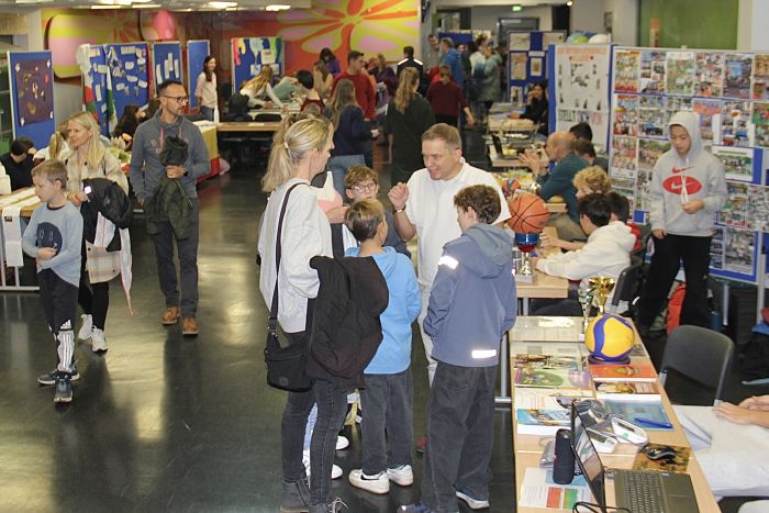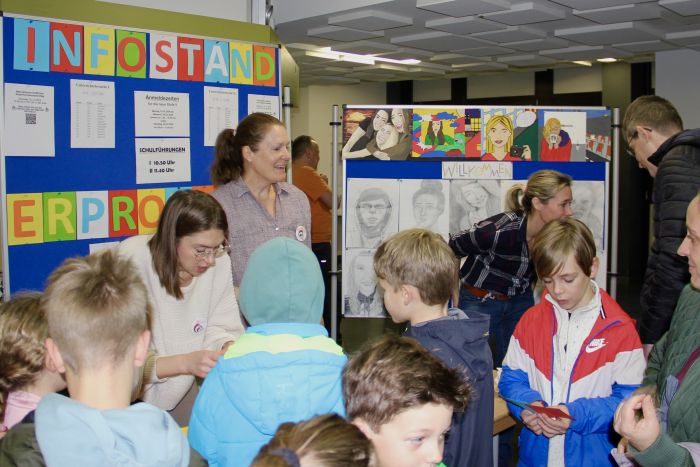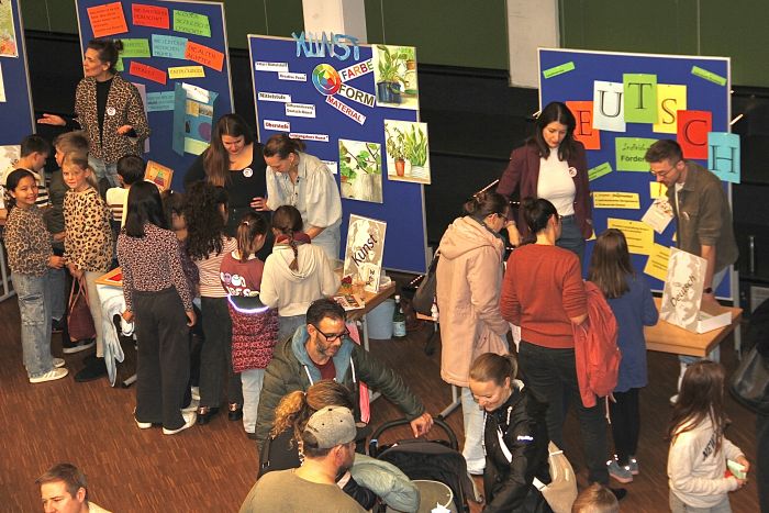 In der Aula stellten sich die Unterrichtsfächer und weitere Projekte und Gruppen des Schullebens vor. Hier konnten Kinder und Eltern viel Wissenswertes über Englisch, Erdkunde, Biologie und Co. erfahren und sich über den sogenannten NIM-Schwerpunkt informieren, der sich mit Naturwissenschaften, Informatik und Mathematik beschäftigt. Doch auch zu dem, was über den reinen Unterricht hinausgeht, gab es viel zu sehen und zu erfahren. Themen wie „Digitalisierung“, „SV- und Elternmitarbeit“, „Demokratie leben“ und vieles mehr gaben den Besucherinnen und Besuchern differenzierte Einblicke.