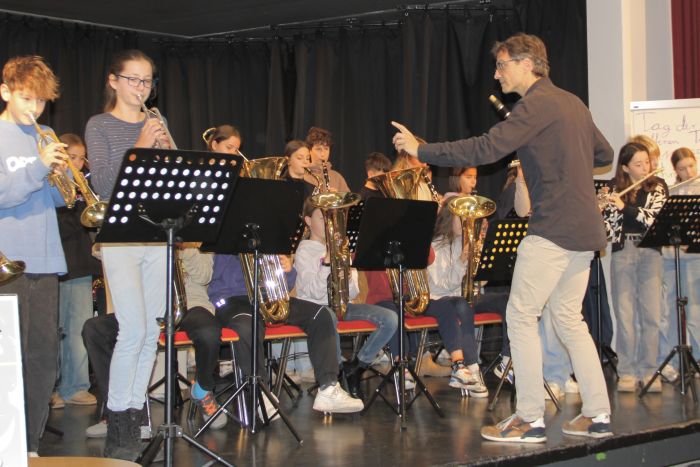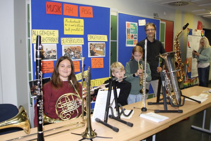 Natürlich war auch für Unterhaltung gesorgt und so gab es von der Bläserklasse eine Kostprobe von der musikalischen Vielfalt der Schule. Bei Kaffee, Keksen und Waffeln war neben dem Feuerwerk der Eindrücke auch Zeit, an den herbstlich dekorierten Tischen in der Aula auszuruhen und ins Gespräch zu kommen.