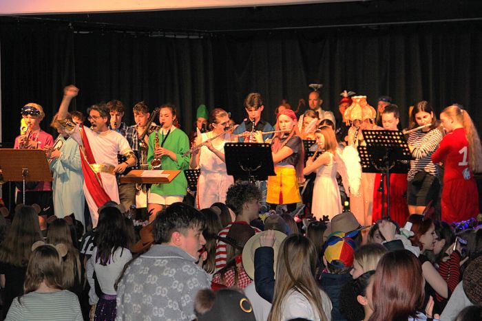 Die SV hatte ein buntes Programm zusammengestellt und war dafür natürlich auf die Schülerinnen und Schüler angewiesen, die bereits wochenlang ihre Beiträge einstudiert hatten. Es gab Tanzdarbietungen zu sehen, jede Menge Stimmungslieder, einen Magier, der das Publikum mit verblüffenden Tricks verzauberte, einen geradezu artistischen Jojo-Jongleur und stimmungsvolle Gesangseinlagen. Auch in diesem Jahr gab es wieder einen Kostümwettbewerb, bei dem das Publikum durch Applaudieren entschied, wer das originellste Kostüm hatte. Der Lehrerchor sang, begleitet von der Concert Band, den Karnevalsklassiker „Pirate“ und das ASG-Lehrerballett sorgte mit einer vielseitigen tänzerischen Darbietung für tosenden Applaus und den krönenden Abschluss der Karnevalssitzung.