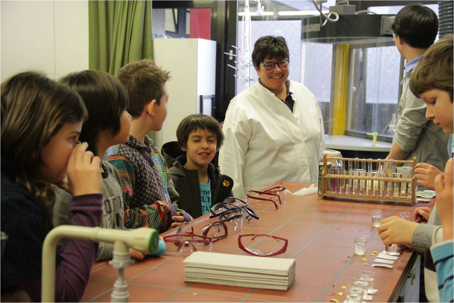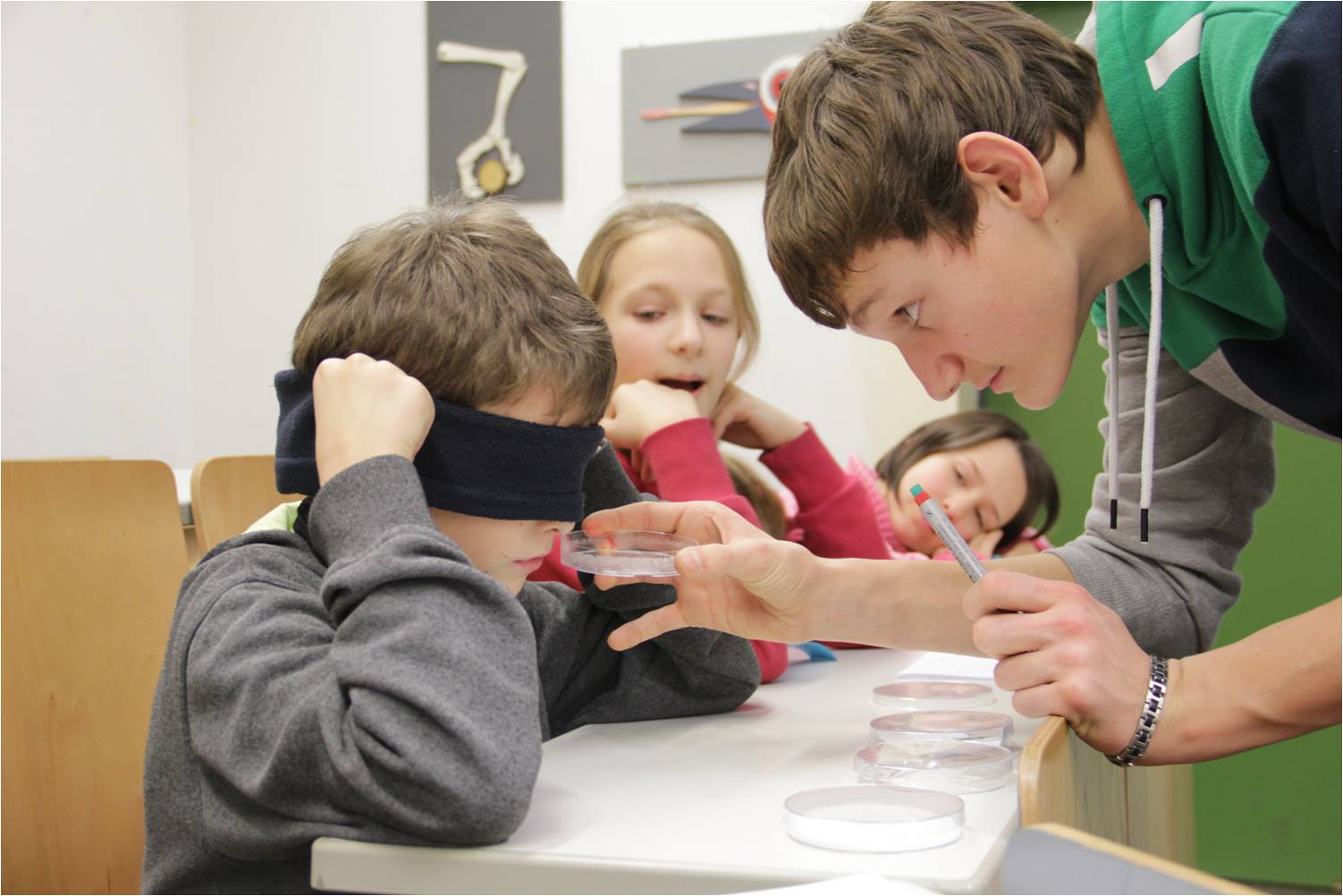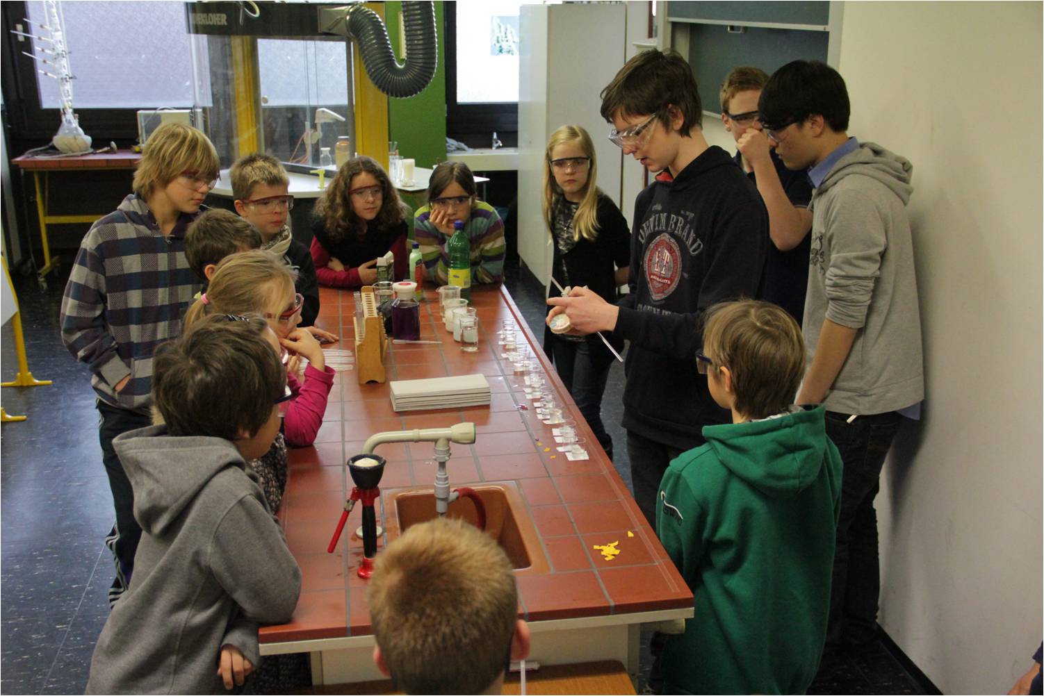 Durchgeführt wurde der Experimentiernachmittag von der Klasse 9n. Sie haben im Vorfeld neun verschiedene Phänomene der Natur und Umwelt aus Biologie, Physik und Chemie erarbeitet und so aufbereitet, dass sie damit Unterricht mit den Viertklässlern durchführen können – die „Größeren“ unterrichten die „Kleineren“.