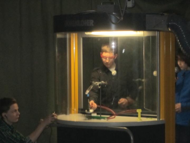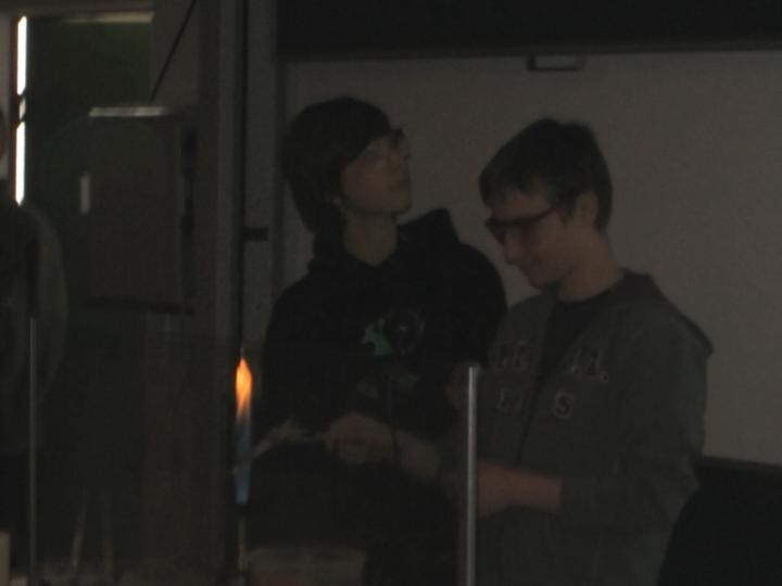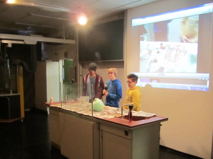 Am Donnerstag, den 09.02.2012, lud die Klasse 8n unter der Leitung von Herrn Jürgensen-Engl vier Klassen der Erprobungsstufe zu einer Chemie-Show in den Chemie-Hörsaal ein. Den Gästen wurde ein abwechslungsreiches Programm geboten. Unter anderem folgende Experimente: „Feuerball“, „Wachsflammenwerfer“, „Gummibärchen im flammenden Inferno“ und die „Elefantenzahnpasta“. Moderiert wurde die Show von unseren witzigen Moderatoren Kai B. und August S. Die Chemie-Show wurde wie nach dem Schema der Fernseh-Show „DSDS“ durchgeführt – wir nannten sie „Deutschland sucht den Superchemiker“. Die Zuschauer wählten am Ende der Show per Zettel ihren Favoriten unter den Experimenten. Alle vier Klassen wählten das Experiment „Feuerball“ auf den ersten Platz.
