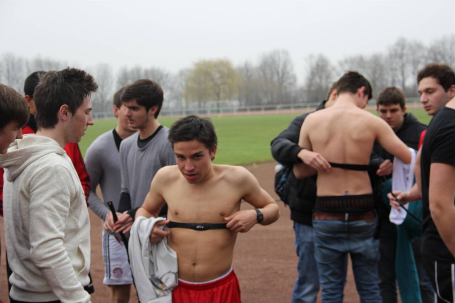 Die Schüler beim Anlegen der Herzfrequenzsender. Zu jeder Belastungsstufe wird auch die Herzfrequenz gemessen.