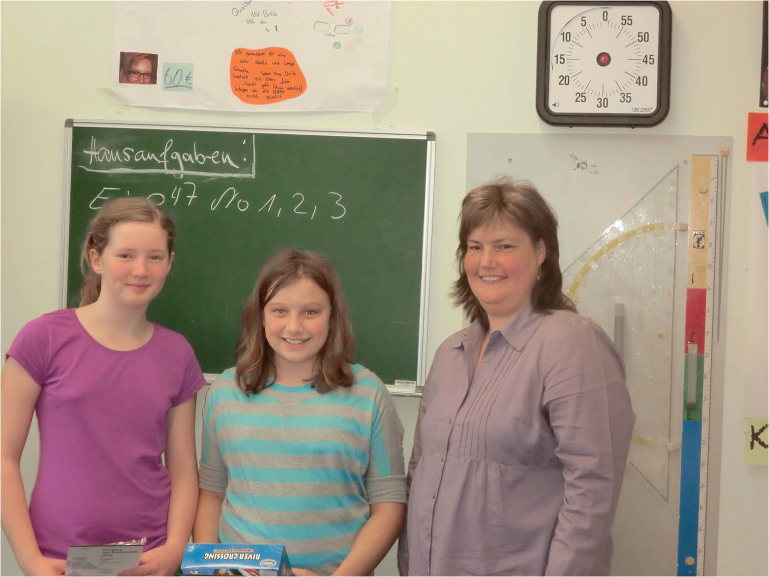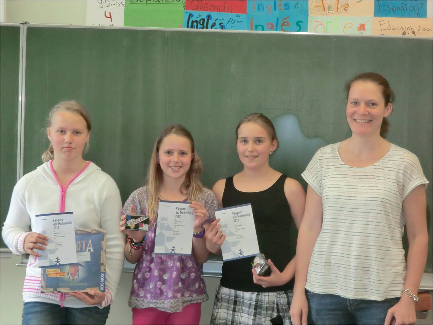 Die Preisträger der Klasse 5s: Joana Heuer, Antonia Bannert und Marlene Reitter mit ihrer Englischlehrerin Frau Bösader.