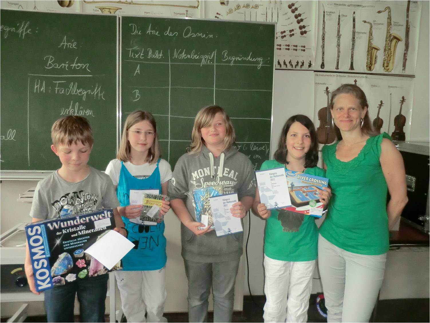 Ganz schön abgeräumt hat die Klasse 5a (ein 1.Preis, zwei 2. Preise und ein 3. Preis) hier mit Musiklehrerein Frau Deuter.