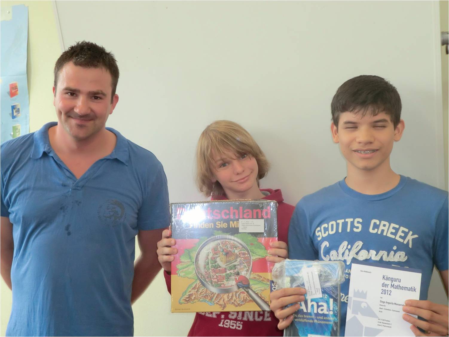 Lukas Müller und Diego Angarita aus der 8s mit ihrem Mathematiklehrer Herrn Kristek. Lukas erzielte am ASG mit 131 Punkten die höchste Punktzahl und landete unter den besten 300 von 70500 Teilnehmern in seiner Alterklasse. Diego gehörte mit seinen 115 Punkten zu den besten 3000 seines Jahrgangs.