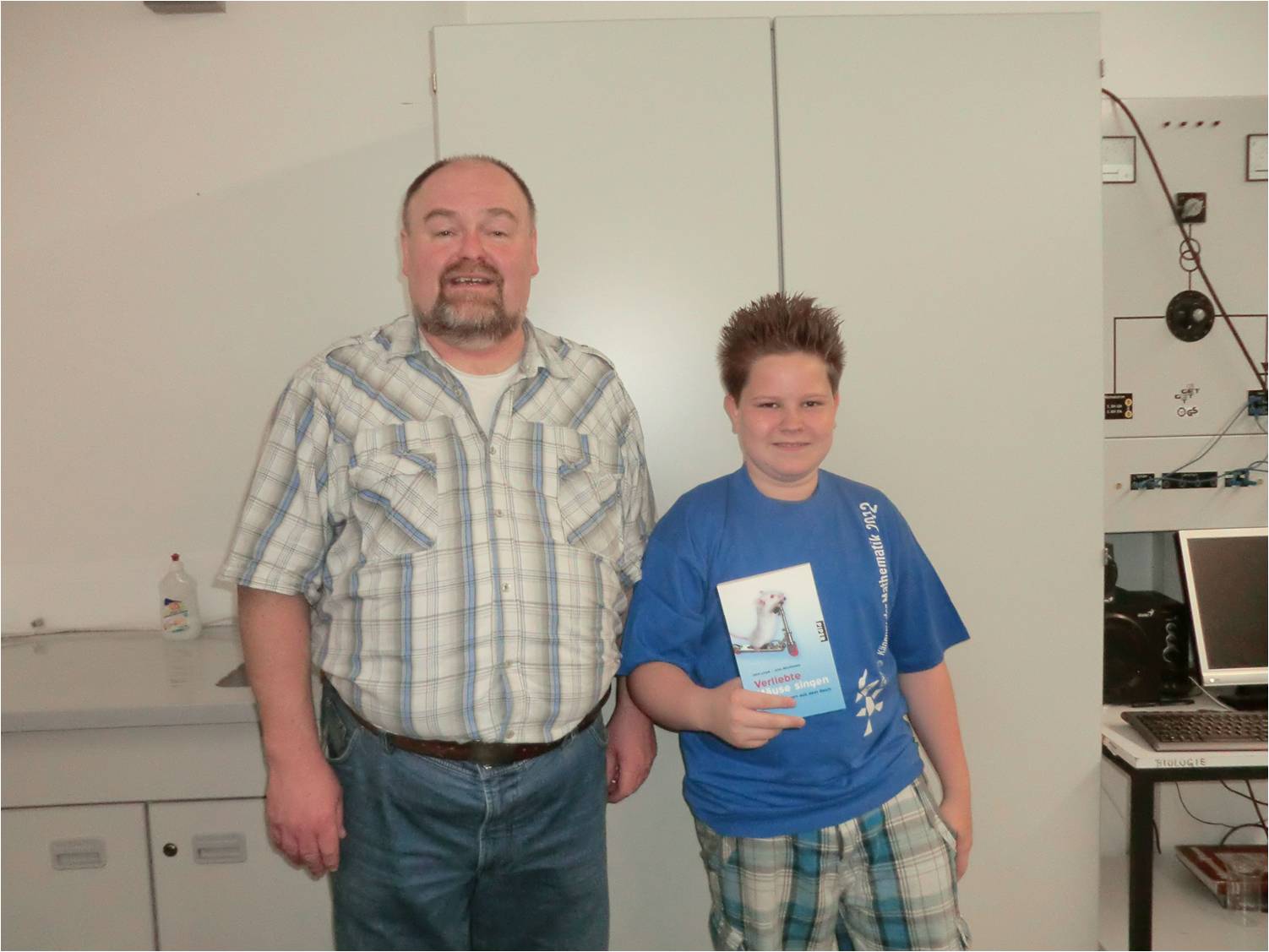 Daniel Kotzian aus der Klasse 8n gewann nicht nur einen 3. Platz sondern schaffte auch die längste Serie an richtig gelösten Aufgaben. Dafür erhielt er zusätzlich ein Känguru T-Shirt. Hier mit Mathematiklehrer Herrn Tesche.