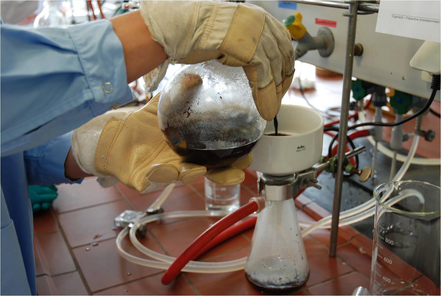 Hierbei mussten wir die Chemikalien (als Hauptkomponenten 4-Acetamidotoluol und Kaliumpermanganat) zunächst einmal einwiegen und sie erhitzen, um eine Reaktion in Gang zu setzen. Hierbei war unser Produkt schon entstanden, es war allerdings noch in gelöster Form mit vielen Nebenprodukten vorhanden. Um unser Produkt „isoliert“ zu erhalten, haben wir es zunächst einmal filtriert, dann die übrige Lösung neutralisiert und wieder filtriert. Hierbei blieb ein Filterkuchen, also eine mehr oder weniger trockene Masse, als Filtrat übrig. Dieses wurde nun umkristallisiert, bis sich ein weißlicher Feststoff gebildet hatte. Dieser wurde nun ein letztes Mal filtriert und noch getrocknet.