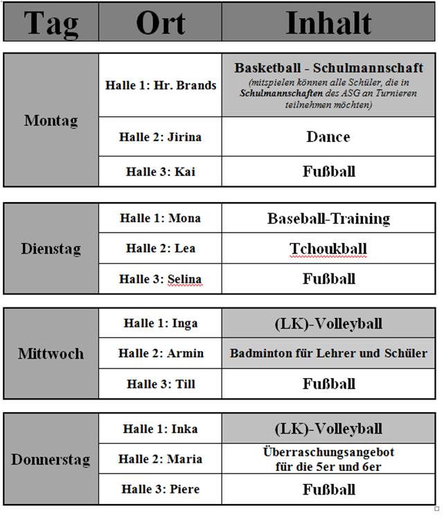 Zu den neuen Angeboten beim Mittagssport (s. Tabelle) gehören ein Basketballtraining von Herrn Brands. Hier sind alle Schüler(innen) eingeladen, die sich für die die Teilnahme an einer Basketball-Schulmannschaft interessieren.