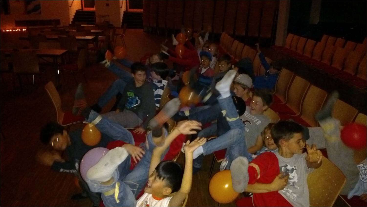Dann gab es viele schöne Spiele! Luftballontanz, Mumienspiel, Halloween-Activity, und vor allem die Nachtwanderung durch dunkle Gänge und Räume – eine echte Mutprobe war das, denn in der Dunkelheit hatten sich Geister versteckt!!