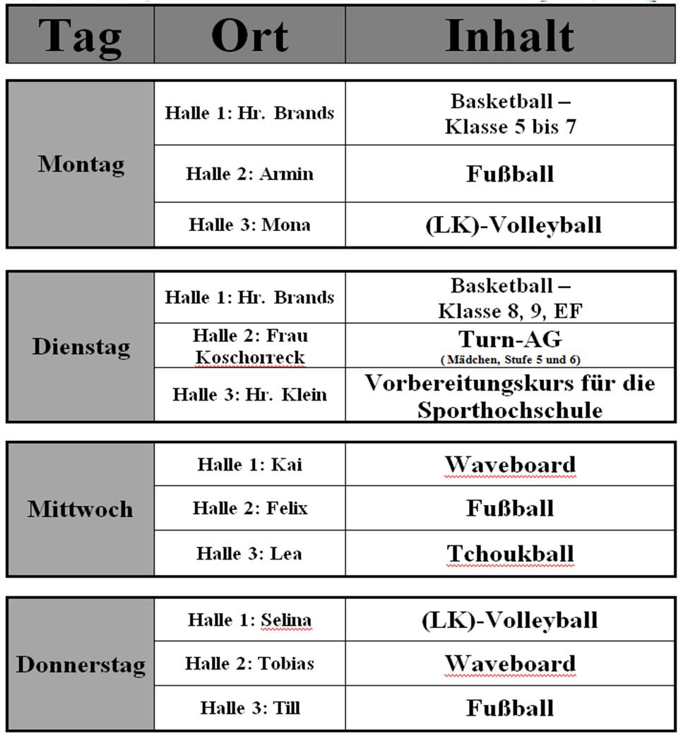 Ab sofort gilt der neue Plan für den Mittagssport. Neu ist die Turn-AG mit Frau Koschorreck. Alle Mädchen aus den Klassen 5 und 6 können hier für einen Turn-Wettkampf üben, an dem gemeinsam teilgenommen wird. Kommt doch einfach mal dienstags vorbei! In allen 1. großen Pausen leihen zudem weiterhin die Sporthelfer Spielgeräte aus.