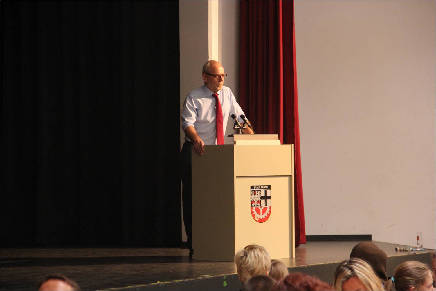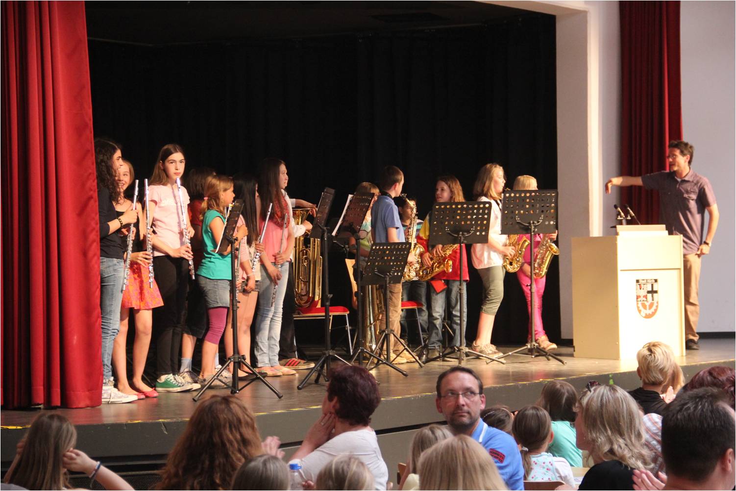 Nach einer musikalischen Darbietung der Bläserklasse der jetzigen Stufe 5 unter der Leitung von Herrn Grüner sprachen Herr Fischer und Herr Schäfer Grußworte an unsere Gäste. Anschließend riefen die Klassenlehrer ihre Schülergruppen auf und gingen mit ihnen in die neuen Klassenräume: