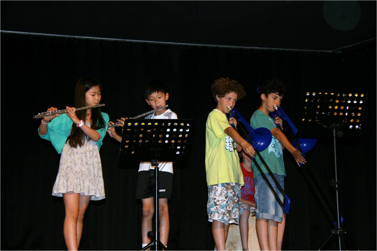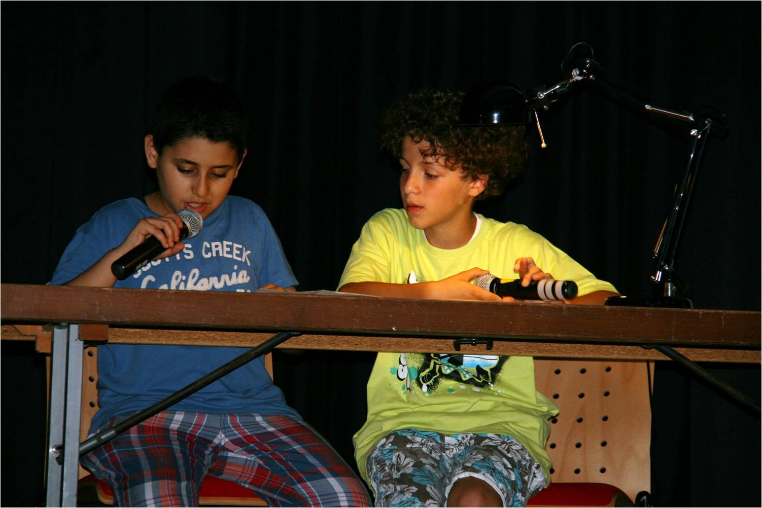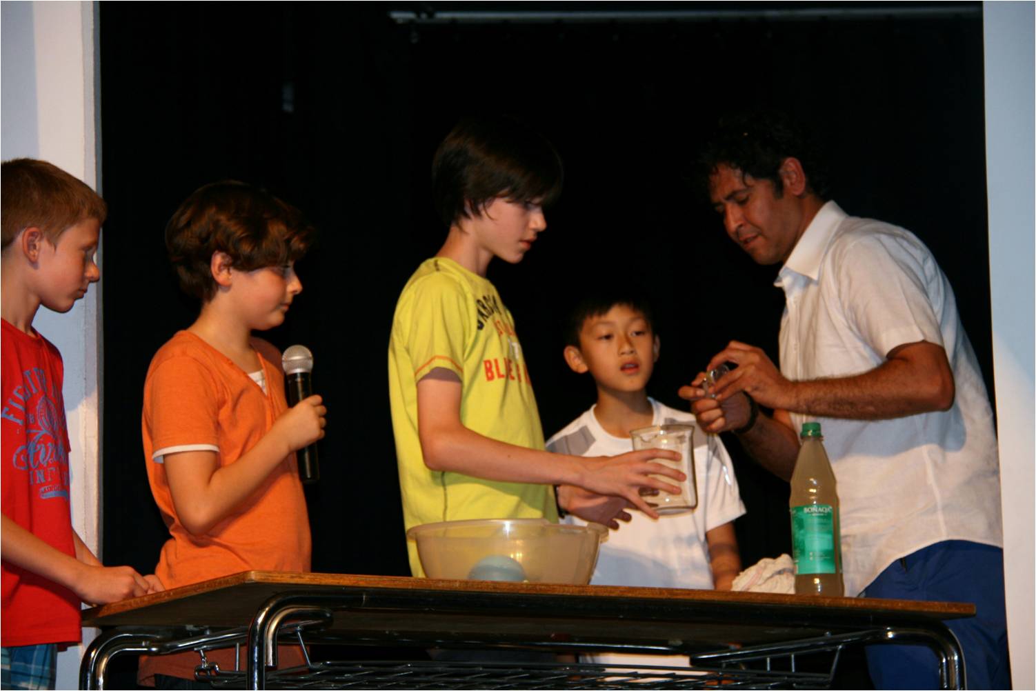 Anna-Lena, Eun-Su, Kassra und Silas führten das Publikum als Moderatoren durch das Programm, das auf der Bühne begann. Musikalische Beiträge gab es von der Singeklasse, der Bläserklasse sowie von Julia und Lukas auf dem Klavier und Martin an der Gitarre. Des Weiteren lasen Mohammed und Andreas eine im Deutschunterricht entstandene Geschichte von Karolina vor, eine Gruppe der Klasse spielte ein selbstgeschriebenes Theaterstück („Schulalltag - 2 Unterrichtsstunden“) und vier Kinder des NIM-Kurses demonstrierten drei Live-Experimente.