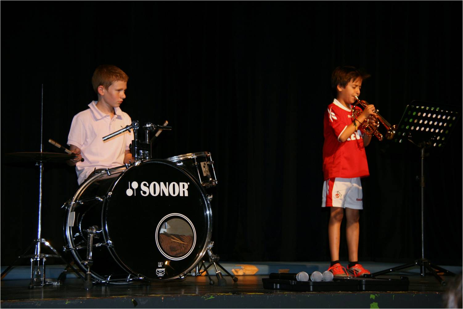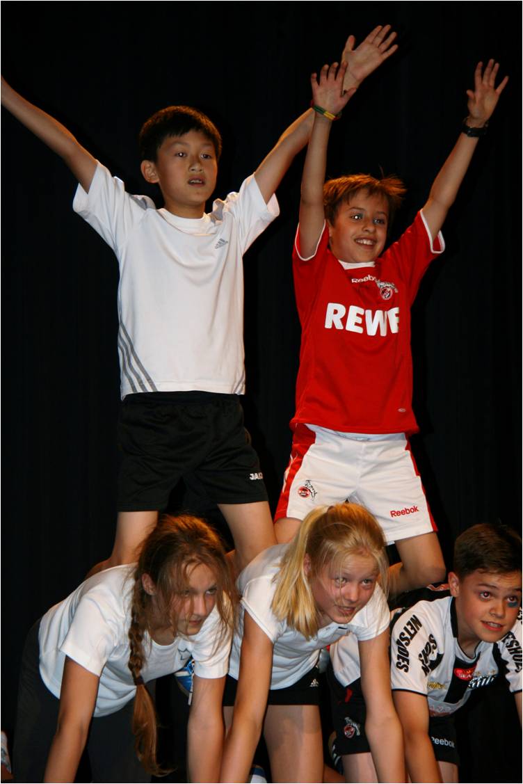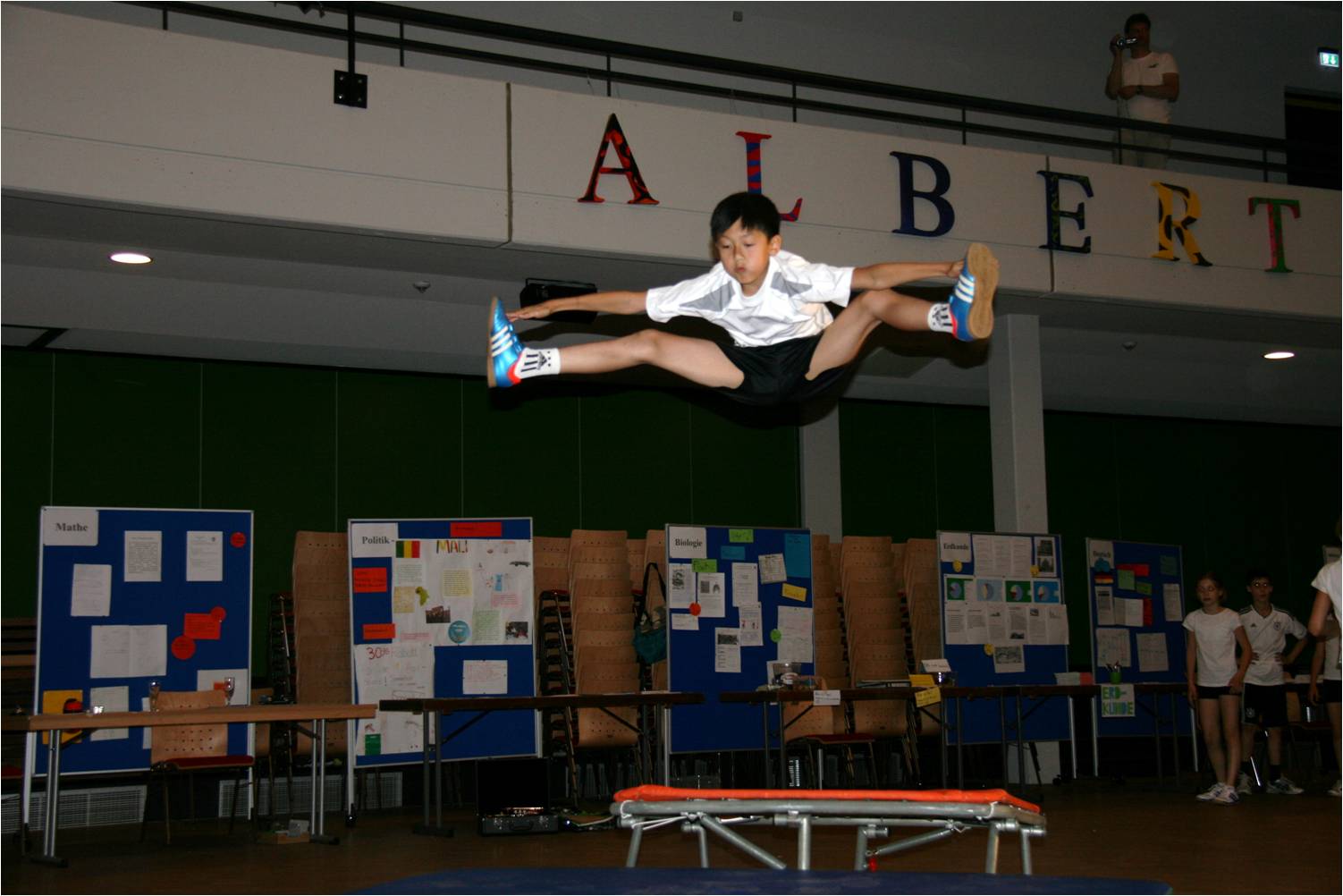 Der abschließenden Bühnenblock wurde von einem Musikbeitrag von Tobias und Armin (Schlagzeug und Trompete) eingeleitet, bevor Tobias und Andreas Bilder der Events des abgelaufenen Jahres zeigten („Die Kinder haben wirklich viel erlebt im letzten Jahr!“, kommentierte ein Gast diesen Beitrag). Eine Sportperformance, bei der neben akrobatischen Nummern auch eine Trampolineinlage vorgeführt wurde, rundete das Programm genauso ab wie die Prämierung der besten Leistungen in den Tests der Fächerstände und des Englischunterrichts – stolz wurden die Urkunden in Empfang genommen. Die Tombola, die Anna-Lena, Kassra und Eun-Su organisiert hatten, ergab einen Erlös von 56 €, der nun die Klassenkasse füllt. Danke dafür!