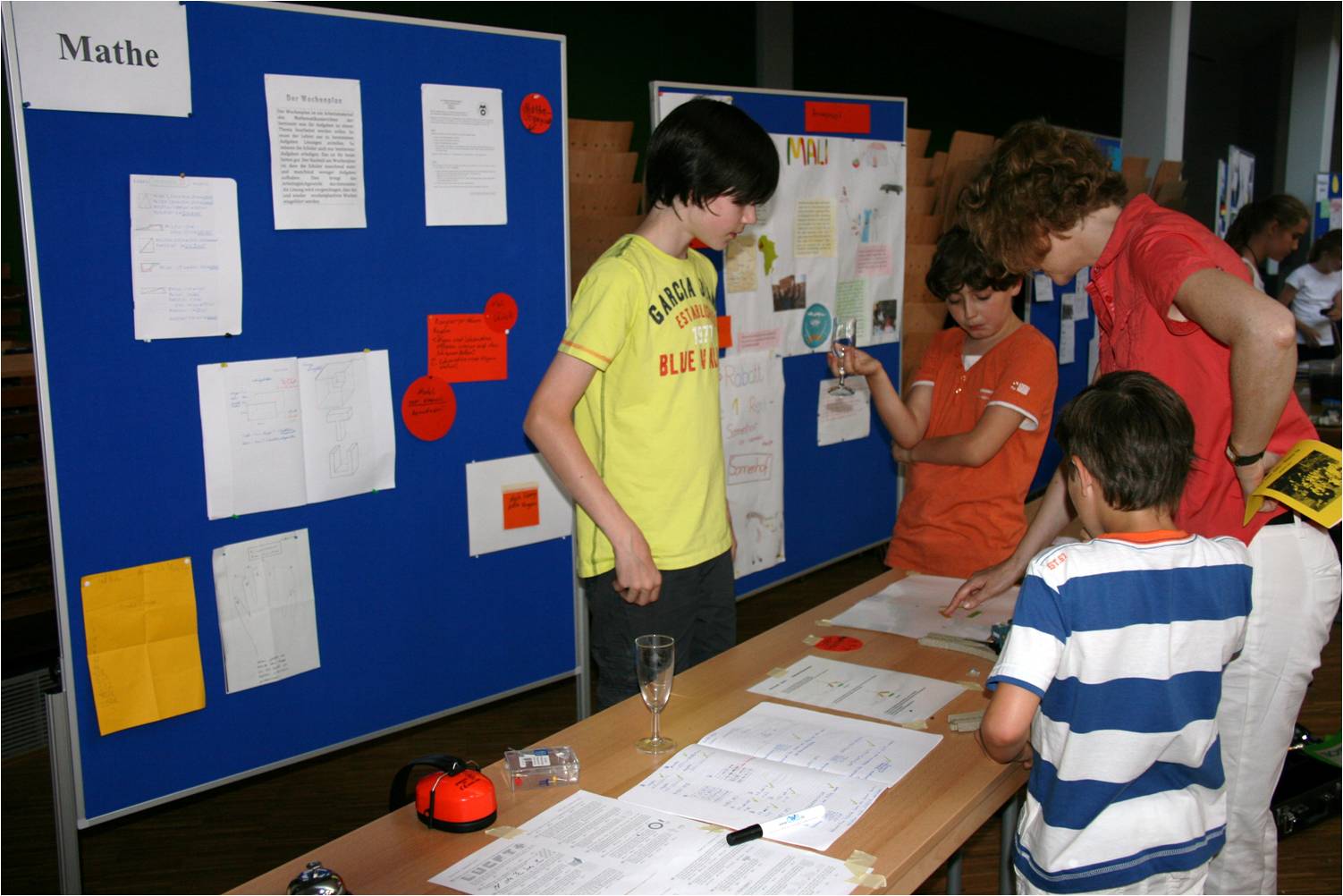 In der Pause gab es zunächst eine Führung durch die Schule, eine englische Schnitzeljagd mit einem abschließenden Labyrinth, das zum „treasure“ führte, und eine Englischstunde für Eltern, in dem zum durchgenommenen Thema auch ein abschließender Test geschrieben wurde. Anschließend gab es neben einem kulinarischen Büffet das Angebot, an zwölf Fächerständen vielfältige Unterrichtsergebnisse zu erkunden und einzusehen.