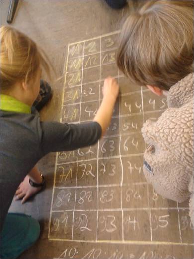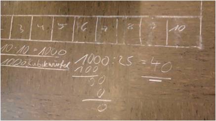 Zuerst malten wir einen Quadratmeter auf den Boden und rechneten so aus, wie viele Kubikdezimeterwürfel jeder von uns über die Ferien bauen musste.