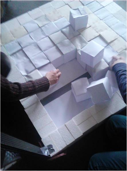 Nach den Ferien begann dann die Bauphase: Das Gerüst war da, doch einigen war beim Bauen die Puste ausgegangen, sodass einige Würfel fehlten. – Kein Problem: Wir teilten uns in drei Gruppen auf: Eine kümmerte sich um die weitere Produktion der Kubikdezimeter, eine Kreativgruppe wurde gegründet u