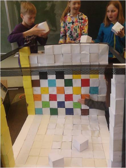 Während des Bauens waren wir immer wieder selbst erstaunt, dass unser Vorhaben doch länger dauerte als erwartet: Erst in der ersten Doppelstunde schafften wir nur den Boden (das waren ja dann immerhin schon 100 kleine Würfel), bei den Wänden mussten wir dann immer wieder Stabilität und Maße im Auge behalten: Wie genau müssen die Kubikdezimeterwürfel gebastelt sein, damit wirklich zehn in eine Reihe passen? Wie bekommen wir es hin, dass die Wand (vor allem während des Zusammenbaues) nicht schief wird oder umkippt?