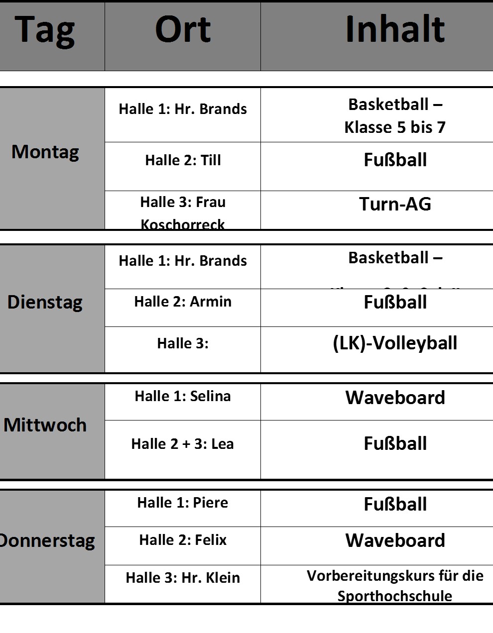 Ab sofort gilt der neue Plan für den Mittagssport. Wieder dabei sind die Turn-AG mit Frau Koschorreck, die beiden Basketball-AGs mit Herrn Brands und der Vorbereitungskurs für die Sporthochschule mit Herrn Klein. In allen 1. großen Pausen leihen zudem weiterhin die Sporthelfer Spielgeräte aus.