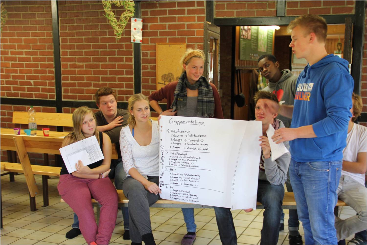 Der Dienstag begann mit einem gemeinsamen Frühstück, anschließend ging es noch einmal an die Arbeit, denn die letzten beiden Einheiten warteten. Danach stellten alle vier Gruppen ihre Ergebnisse vor und diskutierten einige Vorschläge im Plenum. Über die guten Resultate freuten sich nicht nur die Mitglieder der Schülervertretung, sondern auch die SV-Lehrer Frau Lohoff, Herr Spießer und Herr Novy.