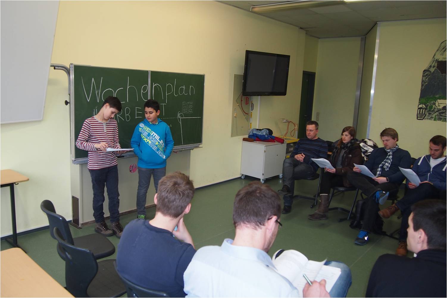Sechs Schüler unserer Stufe 6 stellten 32 angehenden Lehrern vom Studienseminar Köln ihre Erfahrungen rund um die Wochenplanarbeit im Mathematikunterricht dar. Am Ende lobte Wolfgang Riemer, Fachleiter des Studienseminars, die Gruppe der Sechstklässler u.a. mit den Worten: „Es war für mich sehr beeindruckend, mit welcher Souveränität ihr die Fragen der Studienreferendare beantwortet habt!“ und händigte allen eine Urkunde aus! „Das ist schon mal für euren Lebenslauf … !“