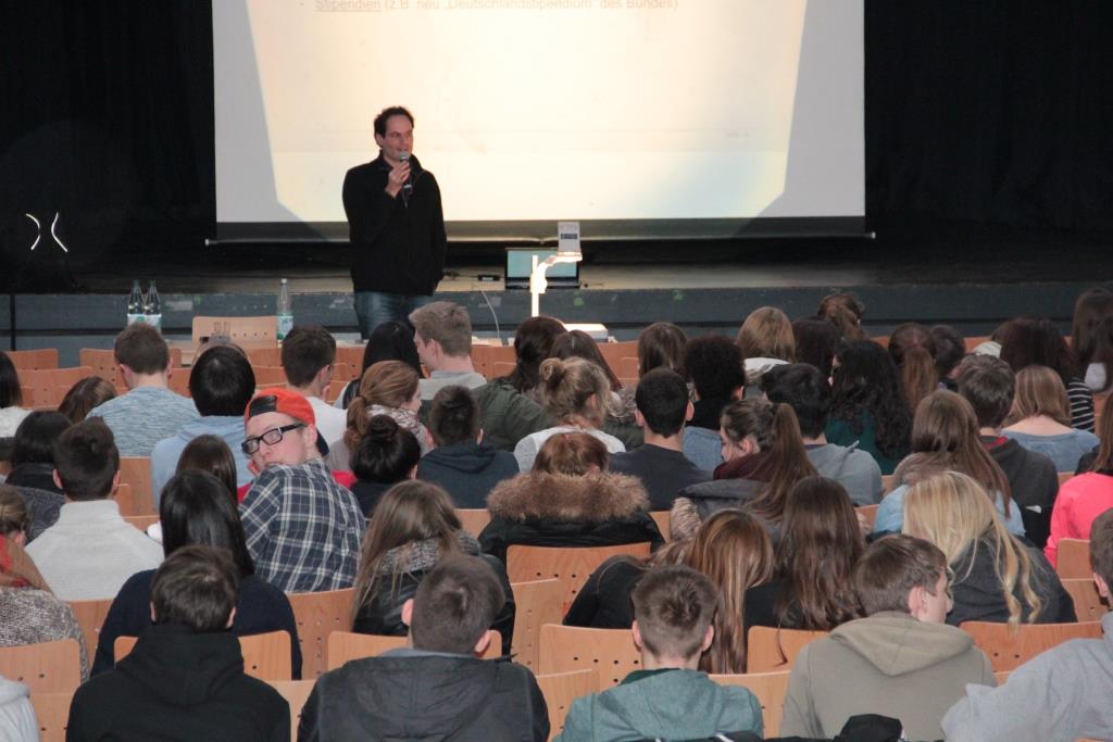 Der Berufsorientierungstag startete mit einer Informationsveranstaltung der Arbeitsagentur in der Aula über die allgemeinen Ausbildungs- und Studienmöglichkeiten sowie die anstehenden Bewerbungstermine und Verfahren nach dem Abitur. So konnten die Schülerinnen und Schüler erfahren, dass selbst für die 11. Jahrgangsstufe bereits Bewerbungsfristen in Kürze anstehen. Der Referent Herr vom Hövel beantwortete in der anschließenden Fragestunde eine Vielzahl an Nachfragen.