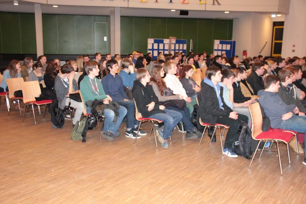 Der Informationsabend bot viele Zugänge zu den verschiedensten Berufsfeldern und Studiengängen. Wenn man noch gar keine Ahnung hatte, wo es hingehen sollte oder ob man schon kurz vor der Entscheidung steht und ganz spezielle Fragen hatte, das war unerheblich. Im Plenum stellten sich die Referentinnen und Referenten kurz vor und nannten Gründe, warum es sinnvoll ist, ihnen in einen bestimmten Klassenraum zu folgen und in einem überschaubaren Rahmen passende Antworten auf drängende Fragen zu erhalten. Anschließend trugen sich die Schülerinnen und Schüler in Listen ein, da es zwei Informationsblöcke gab. Hier zeigte sich, dass das Interesse der Schülerinnen und Schüler sich gleichmäßig auf die angebotenen Berufsbilder verteilte.