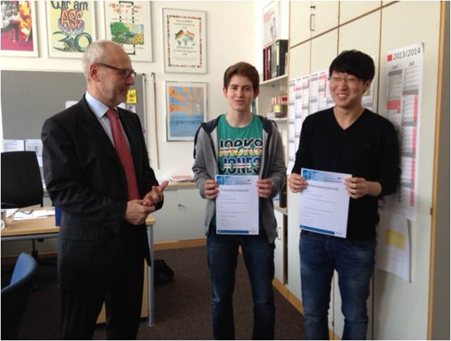 „Erfolgreich auf Mist gebaut“ haben Alexander Röntgen und Michael Zhao, beide Stufe Q1. Damit begann nämlich im Sommer 2013 die erste Runde der Internationalen Chemie-Olympiade 2014: Sie gingen der Frage nach der chemischen Zusammensetzung von Pferdemist auf den Grund und identifizierten mit detektivischem Spürsinn ein verräterisches weißes Pulver in der Nähe der Pferdeboxen. Dazu lösten sie auch Probleme aus den Themenbereichen Redoxreaktionen, Thermoanalyse und organische Synthesen. Das hier erworbene Wissen konnten sie im Herbst in der zweiten Runde anwenden und bearbeiteten anspruchsvolle Aufgaben aus der Analytik, Organischen Chemie und der Spektroskopie. Für diese Mühe wurden sie nun vom Institut der Pädagogik der Naturwissenschaften (IPN) in Kiel als Veranstalter des Wettbewerbs mit einer Urkunde und einem Büchergutschein belohnt. Beides nahmen sie stolz von Alfred Schäfer entgegen, der ihre Leistungen anerkennend herausstellte.