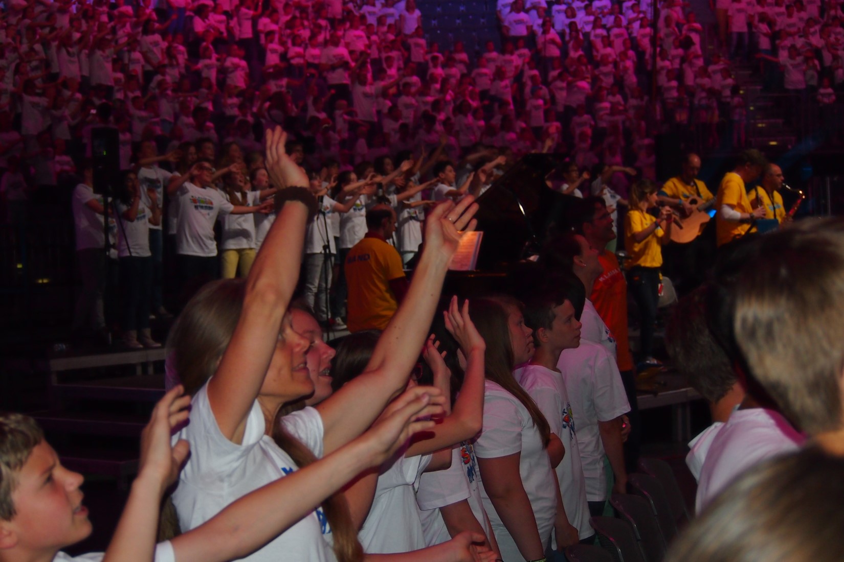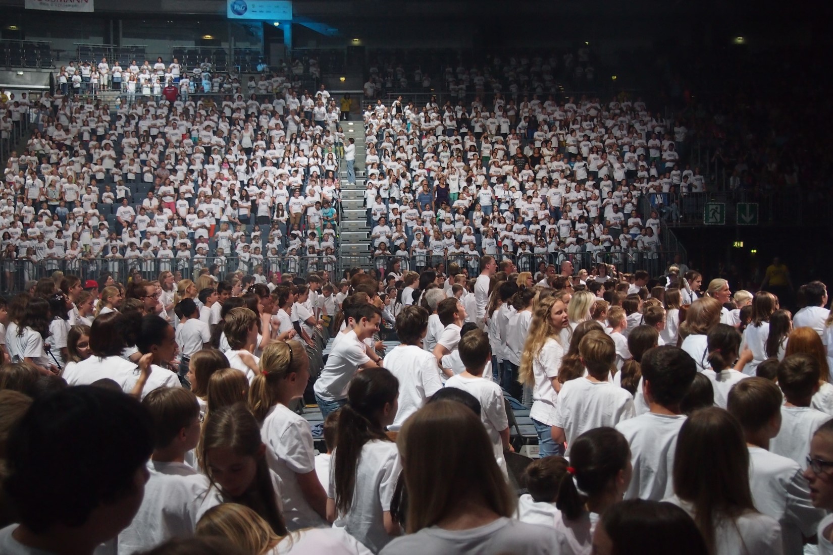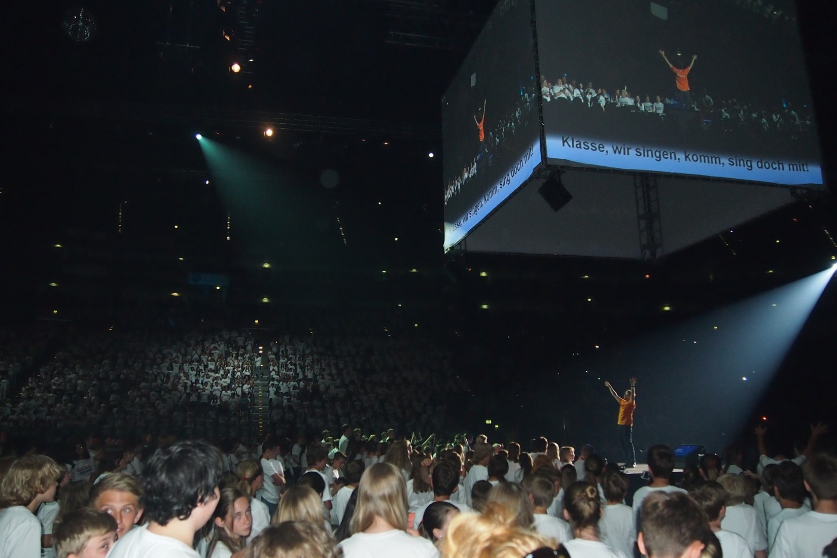 Für die Kinder und 9000 Eltern im Publikum war die Veranstaltung ein besonderes Erlebnis. Eine Heerschar von kleinen Sängern in einheitlichen T-Shirts, die begeistert alle mitschmetterten und tanzten. Da die Liedtexte auf einer großen Leinwand eingespielt wurden, fiel auch das Publikum schnell in den Gesang mit ein und so erweiterte sich der Chor auf ca. 14.000 Menschen!