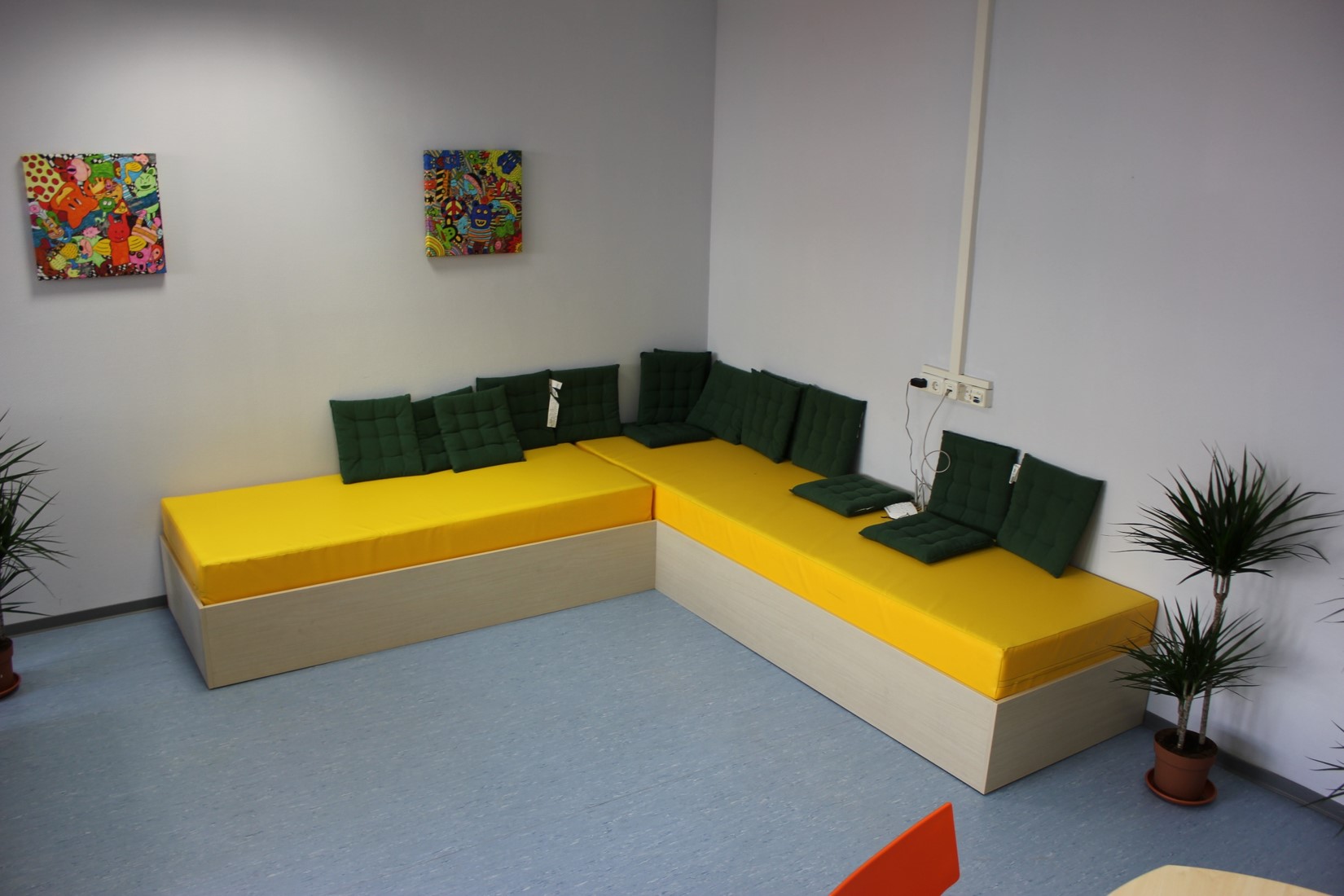 Nach erfolgreichen Verschönerungsarbeiten und dem Erhalt der neuen Möbel erstrahlt der Raum für unsere Schüler des Ganztages in neuem Licht! So können jetzt alle Schüler an den Langtagen den neu hergerichteten Raum (R019 – direkt hinter der Hausmeister-Loge) in der Mittagspause nutzen, um dort auf den Sofas mit Freunden zusammenzusitzen und zu quatschen, an den neuen Tischgruppen Gesellschaftsspiele zu spielen oder mitgebrachtes Essen zu verköstigen. Natürlich kann man auch einfach auf der neuen Liege chillen und sich etwas entspannen. Die gelbe Sitzecke, die extra für uns angefertigt wurde, wurde vom Förderverein unserer Schule gesponsert. Herzlichen Dank dafür und viel Spaß!