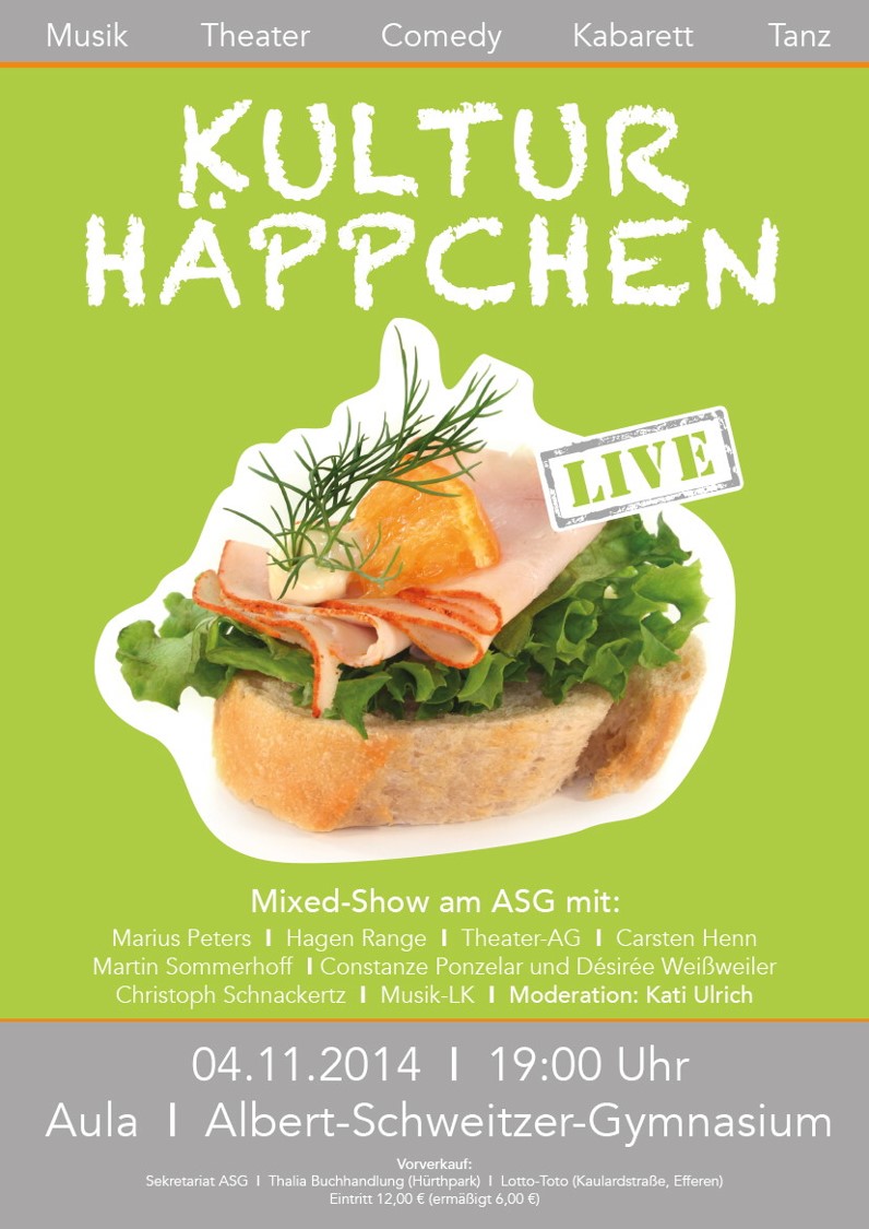 Im Rahmen unserer Jubiläumsfestlichkeiten findet am 04.11.2014, dem Albert-Schweitzer-Tag, unter dem Titel Kultur-Häppchen eine „Mixed-Show“ in der Aula unserer Schule statt.