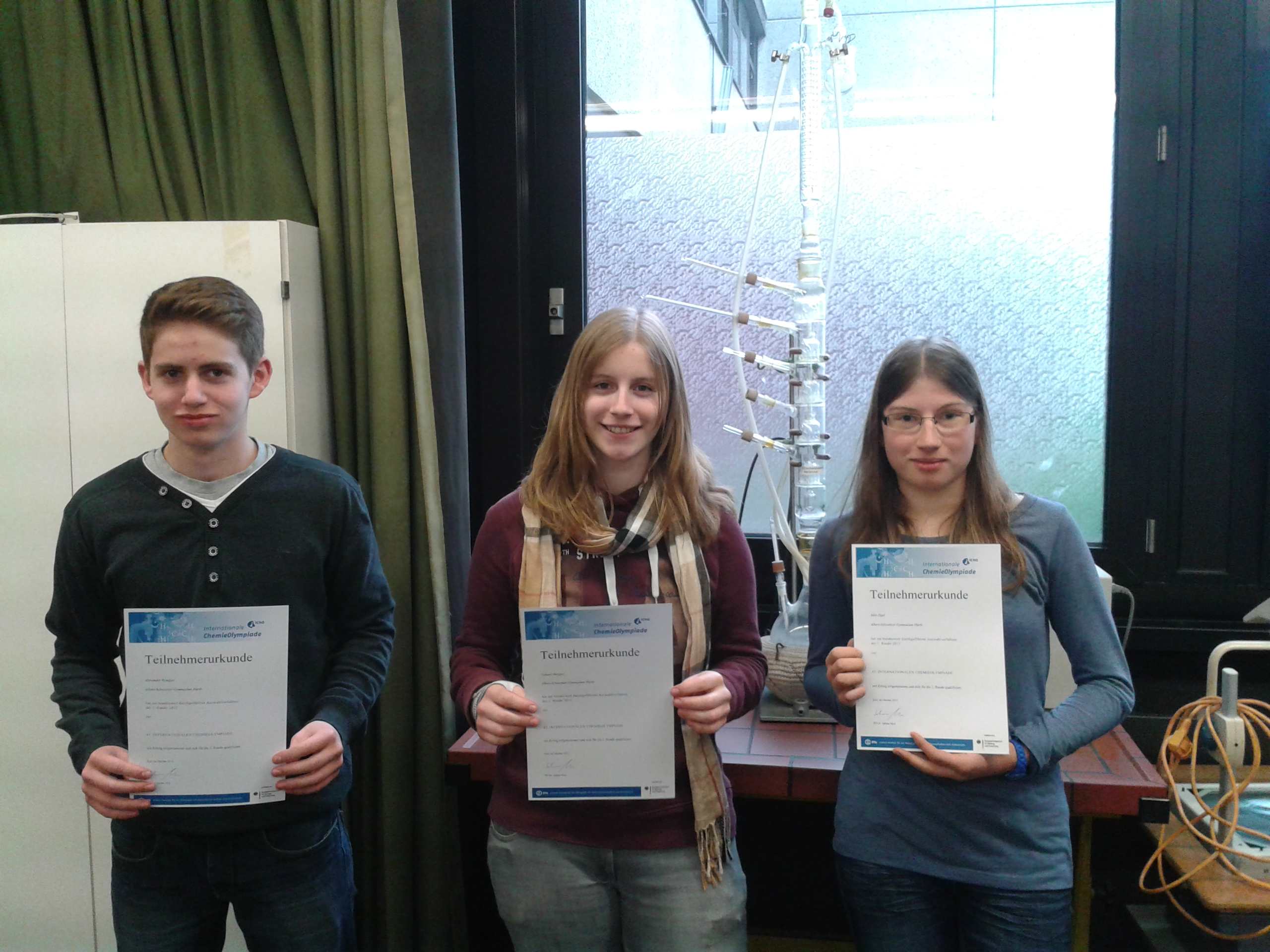 Auch in diesem Jahr konnten sich mit Tamara Hergert, Alexander Röntgen (beide Q2) sowie Ailin Sigel (9s) drei Schülerinnen und Schüler vom ASG für die 2. Runde der Chemieolympiade qualifizieren. Hierzu mussten sie innerhalb von etwa drei Monaten vier Aufgaben aus unterschiedlichen Teilgebieten der Chemie theoretisch bearbeiten. Inhaltlich gingen die Aufgaben über das Schulniveau hinaus, so dass eigenständige Recherchen in der entsprechenden Fachliteratur nötig waren. In der zweiten Runde werden die Aufgaben noch ein wenig kniffliger und sind vom Schwierigkeitsgrad auf Universitätsniveau anzusiedeln. Jedoch muss man nicht alles richtig lösen, um in die nächste Runde einzuziehen.