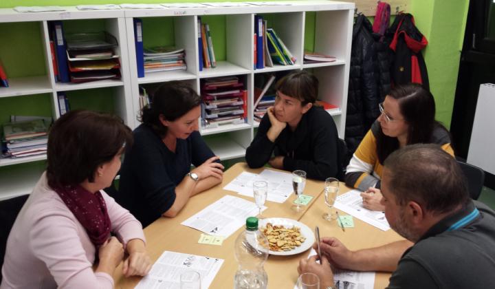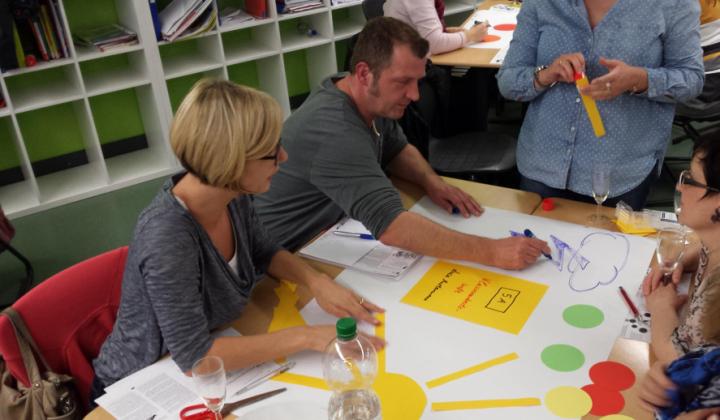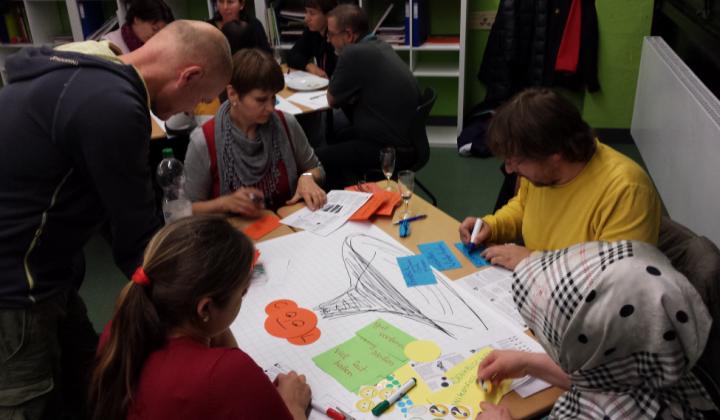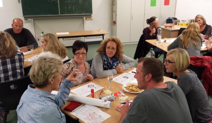 Durch ein ausgeklügeltes System an Laufkarten für die Eltern wurden immer wieder neue „Arbeitsgruppen“ bestehend aus 5-6 Personen zusammen gestellt. Zum einen förderte dies den regen Austausch von Erfahrungen, zum anderen lernte man so auch mal die Eltern kennen, mit denen man vorher noch nie im Gespräch war. In der letzten Gruppe wurde zum Abschluss - zu einem der Themen - ein Plakat für die Kinder erstellt!