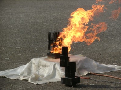 Hier setzte Herr Waczypki von der Feuerwache Hürth zunächst einige Spraydosen in einem Käfig den Flammen aus. Je nachdem, wie die Dosen noch gefüllt waren, knallten sie kräftig und wurden in der Mitte auseinandergesprengt.