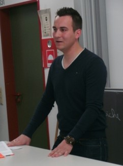 Herr Waczypki beim Brandschutzvortrag und mit einem Teil seines Tafelbildes |