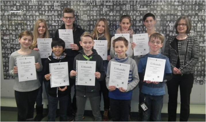 Christine Langen (7c) erhielt als beste Schülerin der 7. Klassen des Rhein-Erft-Kreises mit einem sehr guten Ergebnis einen Sonderpreis und ist Ersatzteilnehmerin für die Landesrunde. Diese Schülerinnen und Schüler sind „wirklich Ausnahmetalente“ (Zitat: Frau Foegen-Rumsmüller, Regionalkoordinatorin der Mathe-Olympiade) an unserer Schule.