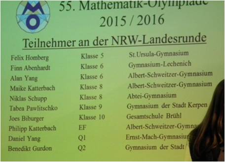 Am 14. November 2015 fuhren dann 10 ASG-Schüler (s.o.) zur Regionalrunde am Gutenberg-Gymnasium in Bergheim. Sie schrieben dort so gute Klausuren, dass wir 9 Preise erzielen konnten! Mit 3 dritten Plätzen, 3 zweiten Plätzen und sogar 3 ersten Plätzen haben sie „ein außergewöhnlich gutes Ergebnis“ (Zitat: Frau Foegen-Rumsmüller, Regionalkoordinatorin der Mathe-Olympiade) erzielt. Für alle anderen Teilnehmer gilt der Olympia-Gedanke: „Dabei sein ist alles!“