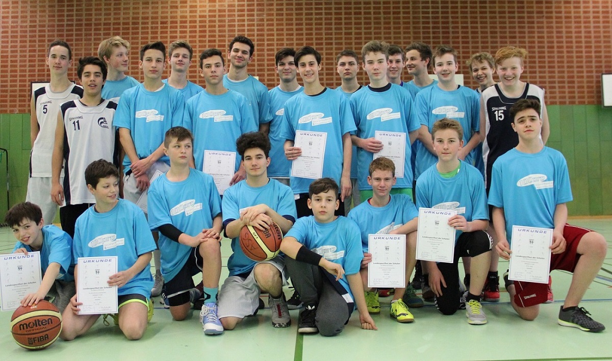 Mit diesen Shirts, zwei Turniersiegen und entsprechender Vorspannung im Gepäck ging es dann für unsere Top-Basketballer der Jahrgänge 1999 jg. (WK II.) zum Bezirksfinale nach Bad Honnef. Hier galt es sich die Tickets für das Landesfinale in Paderborn zu erkämpfen: gegen das Heilig-Geist-Gymnasium aus Würselen (Vertretung der Städteregion Aachen), gegen das Beethovengymnasium aus Bonn (für den Kreis Bonn) und gegen die Schule "Schloss Hagerhof" aus Bad Honnef (für den Rhein-Sieg-Kreises).