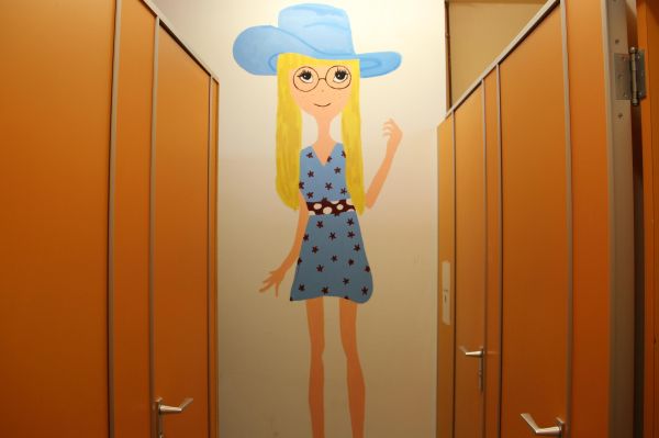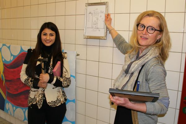 Dieses Thema war der Schulgemeinde schon seit längerer Zeit ein Dorn im Auge gewesen. Verschmutzte Kloschüsseln, nicht vorhandene oder defekte Seifenspender, herumliegendes Papier und triste Wände machten die Schultoiletten zu sehr unschönen Räumen, die kaum ein Schüler gerne aufsuchte. Daher kam das Problem im vergangenen Jahr auf die Tagesordnung einer Schulkonferenz, auf der eine Änderung dieses untragbaren Zustandes beschlossen wurde. Auf Initiative der Elternschaft erklärten sich unter der Federführung von Frau Heß Schülerinnen und Schüler der Mittel- und Oberstufe bereit, die Toiletten zu verschönern. So rüstete sich unter anderem die Kunst-AG von Herrn Peltzer mit Farbe und Pinseln aus und bemalte die Wände in den Toilettenräumen mit Bildern, zum Teil von bekannten Comicfiguren. Zudem wurden neue Seifenspender, Abfalleimer und Handtrockner angeschafft. So wurden die Toiletten nach und nach von "stillen Örtchen" zu "schicken Örtchen", wie Frau Willenbrink treffend formulierte.