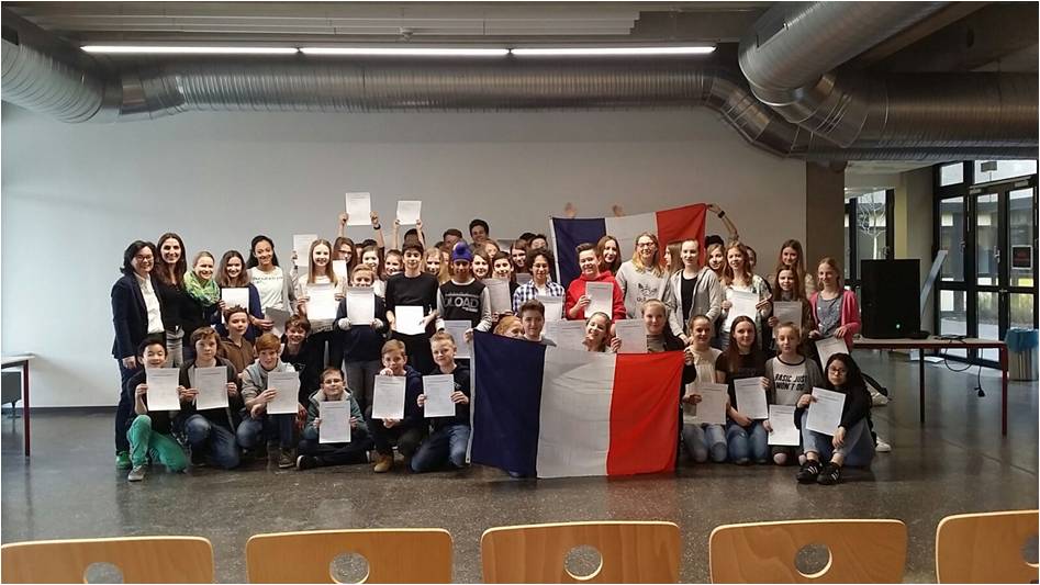 …Französisch mal anders. Stolz und glücklich konnten am Freitag, den 8.04.2016 ALLE 58 angemeldeten Teilnehmer am DELF- Sprachzertifikat am Albert Schweitzer Gymnasium ihre Urkunden aus den Händen von Frau Willenbrink in Empfang nehmen. Das Diplôme d’Etudes en Langue Française, bestehend aus einer schriftlichen und einer mündlichen Prüfung vor einer französischen Jury, ist ein weltweit anerkanntes Sprachzertifikat. Unter der Federführung des Französischteams des ASG konnten alle Teilnehmer aus der Jahrgangsstufe 7 überdurchschnittlich gute Ergebnisse erzielen: über 25% erreichten mehr als 90 von 100 Punkten„Ich wusste gar nicht, dass ich schon so viel sagen kann!“, so die einheitliche Resonanz seitens der Schüler.