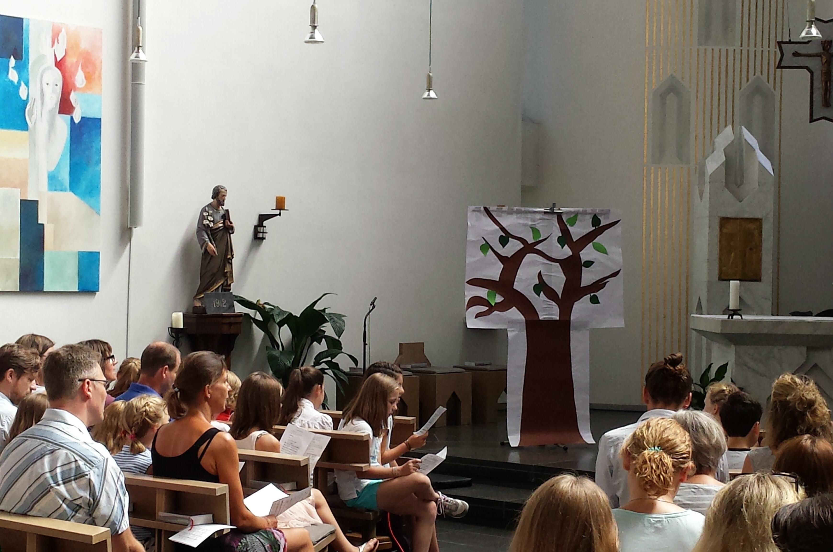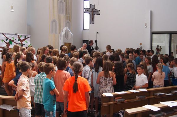 Die Begrüßung der neuen Fünftklässer beginnt mit einem ökumenischen Gottesdienst, geleitet vom katholischen Pfarrer Kremer und dem evangelischen Diakon Oppenberg und gestaltet von den ehemaligen Fünftklässlern. |