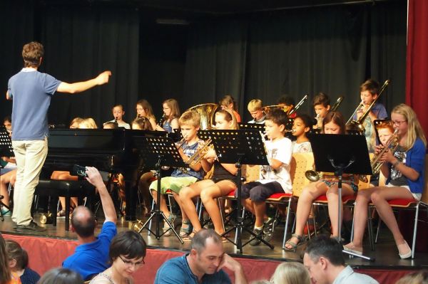 Schulleiterin Frau Willenbrink heißt die neuen Fünftklässler am ASG willkommen, die Bläserklasse der Stufe 6 spielt zur Begrüßung. |