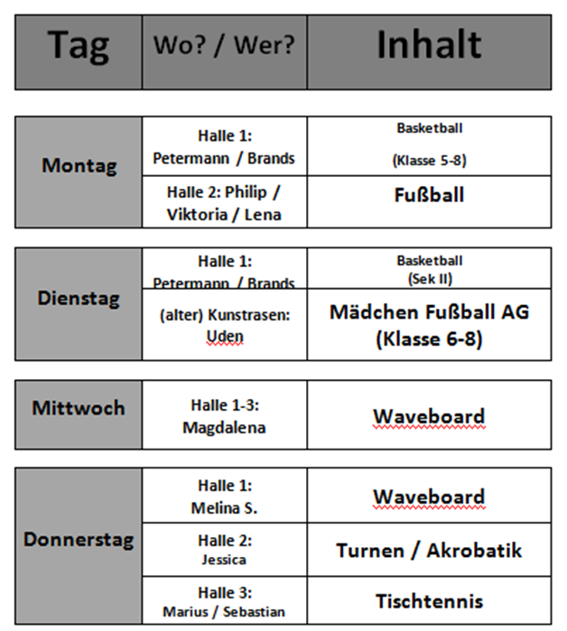 Ab sofort gilt der neue Plan für den Mittagssport. Wieder dabei sind die beiden Basketball-AGs mit Herrn Brands und Frau Petermann, die Mädchen-Fußball AG sowie die Waveboard- Fußball- und Tischtennis-angebote. Wir freuen uns auf euren Besuch!