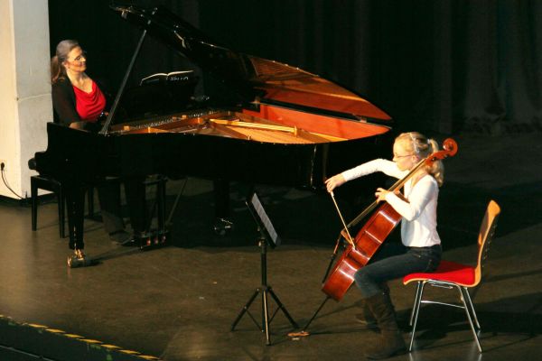 Kontrasprogramm: "Der Schwan" aus dem "Karneval der Tiere", vorgetragen von Freya am Cello und Frau Wasen am Klavier, gefolgt von dem Rocksong "Can't stop", dargeboten von Nico, David und Jean Luc. |